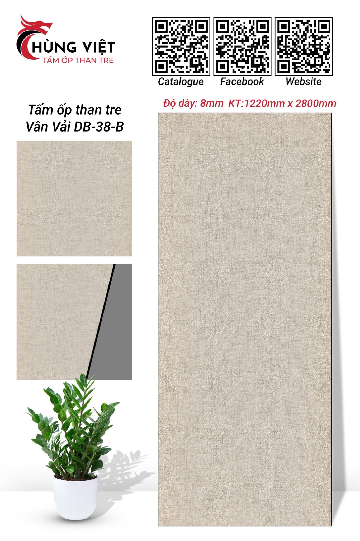 Tấm ốp than tre Hùng Việt vân vải  DB-38B là sản phẩm trang trí nội thất thế hệ mới, kết hợp hoàn hảo giữa vẻ đẹp tự nhiên của vân vải độc đáo và công nghệ sản xuất hiện đại từ than tre. Sản phẩm mang đến giải pháp ốp tường/trần giả vải sáng ốp được góc cong với độ bền cao đến 25 năm.