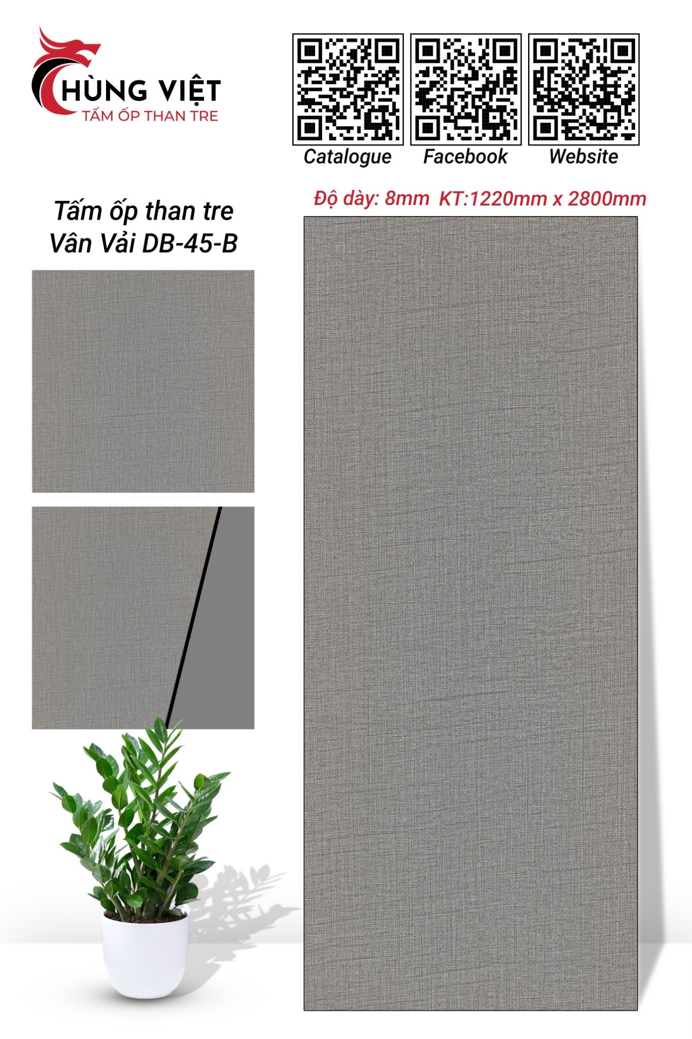 Tấm ốp than tre Hùng Việt vân vải DB-45B là sản phẩm trang trí nội thất thế hệ mới, kết hợp hoàn hảo giữa vẻ đẹp tự nhiên của vân vải độc đáo và công nghệ sản xuất hiện đại từ than tre. Sản phẩm mang đến giải pháp ốp tường/trần giả vải sáng ốp được góc cong với độ bền cao đến 25 năm.