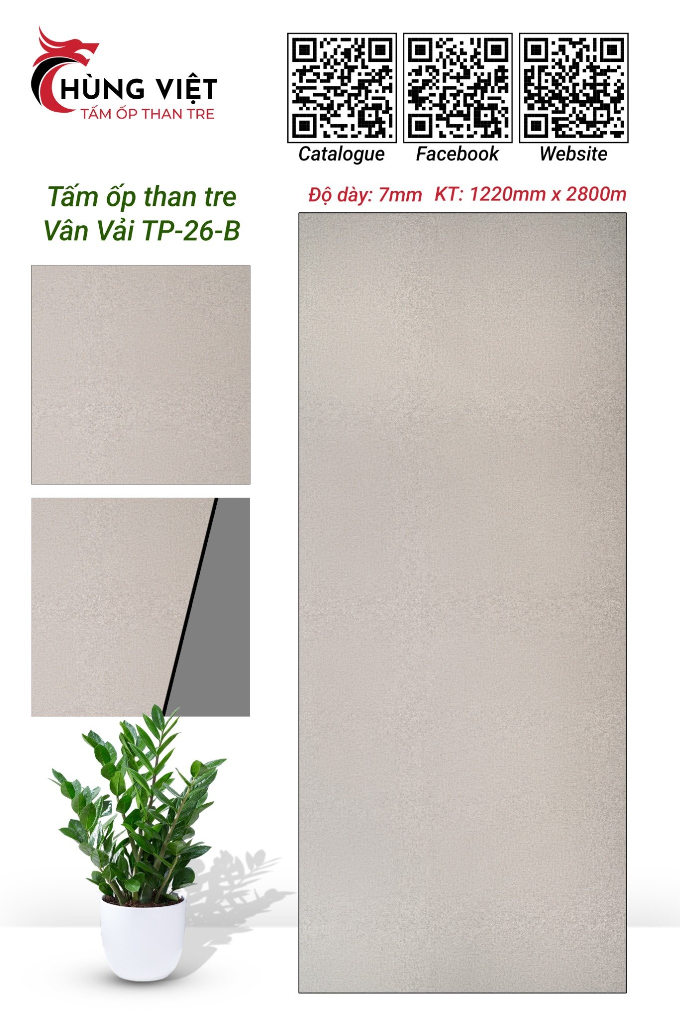 Tấm ốp than tre Hùng Việt vân vải TB-26B là sản phẩm trang trí nội thất thế hệ mới, kết hợp hoàn hảo giữa vẻ đẹp tự nhiên của vân vải độc đáo và công nghệ sản xuất hiện đại từ than tre. Sản phẩm mang đến giải pháp ốp tường/trần giả vải sáng ốp được góc cong với độ bền cao đến 25 năm.
